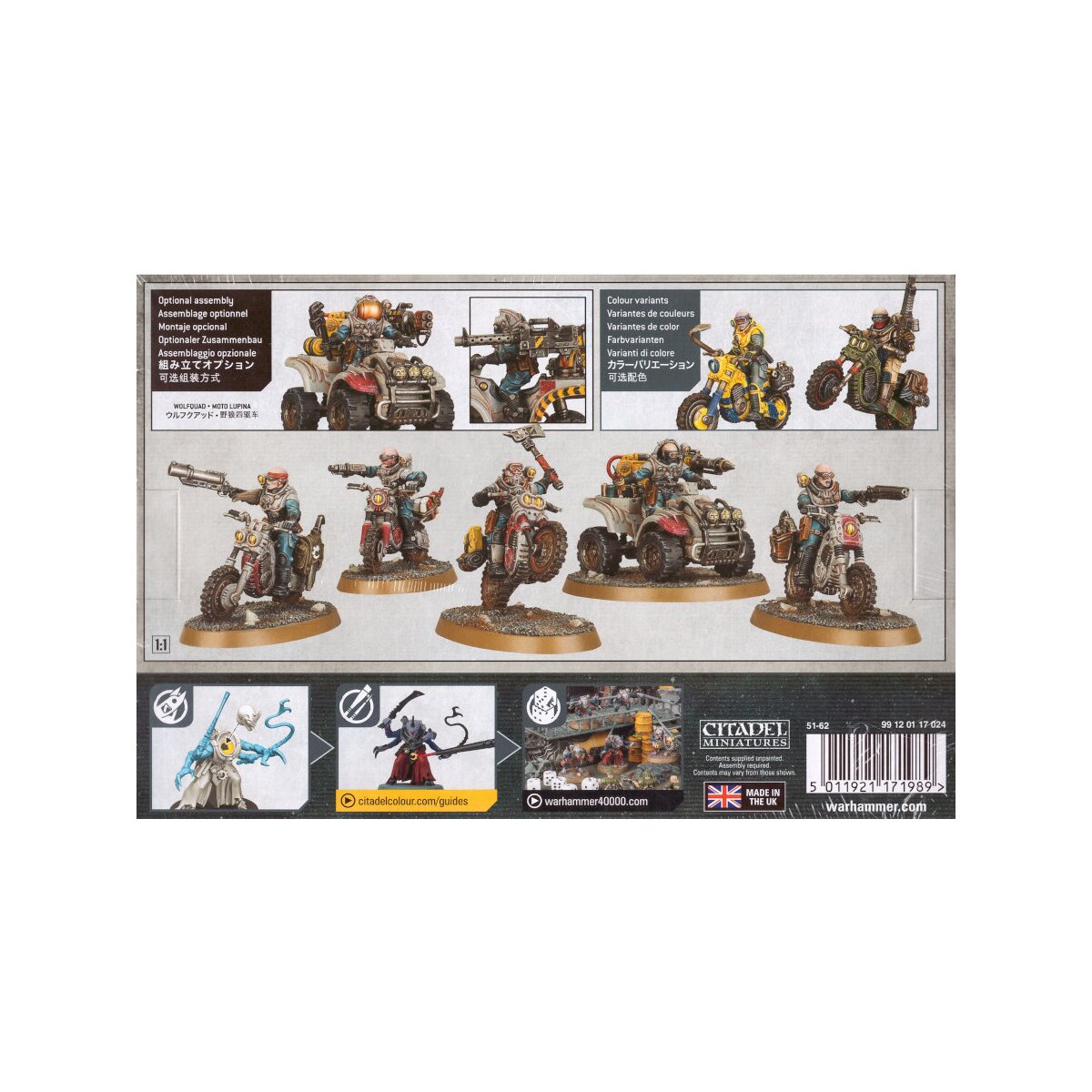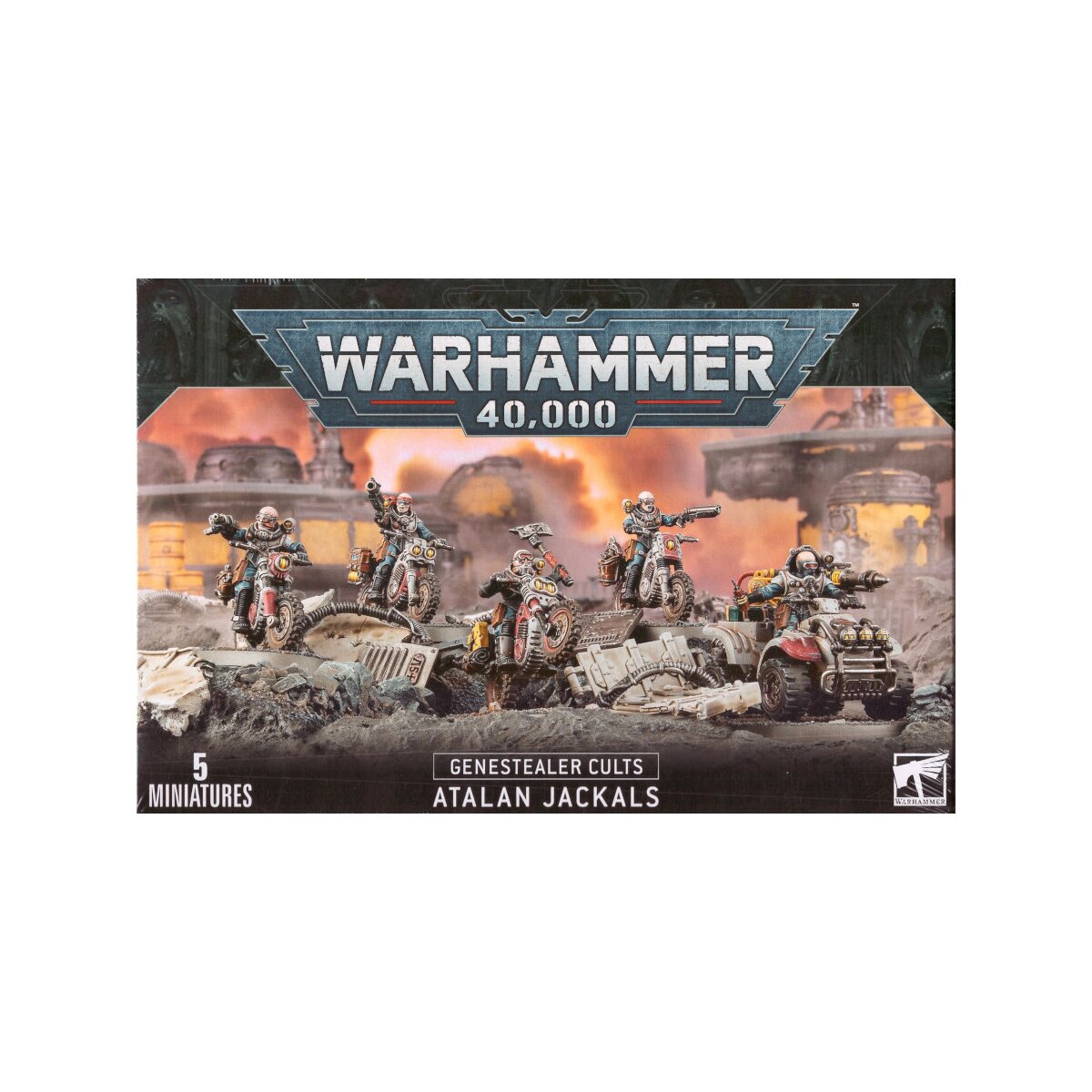 Dieser mehrteilige Kunststoff-Bausatz enthält alle notwendigen Komponenten zum Bau einer Einheit aus 5 Atalan Jackals, vier von ihnen mit Crossmaschinen und einer mit Atalan Wolfquad.