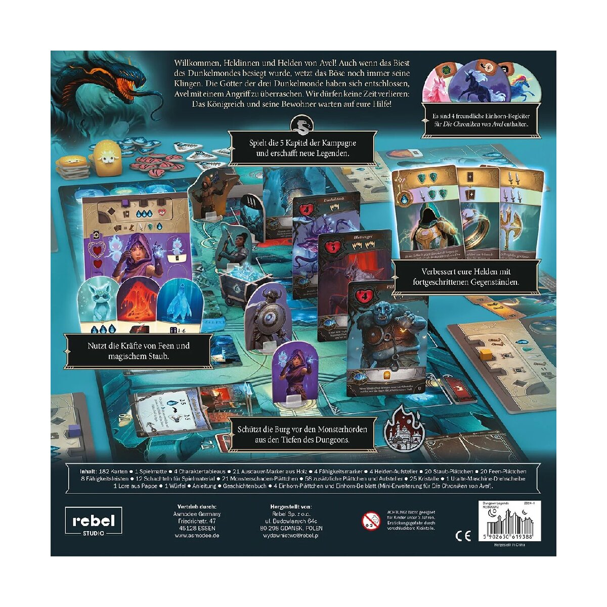 Im kooperativen Deckbuilding-Spiel Dungeon Legends begebt ihr euch auf die Reise in uralte Tunnel und Kammern unter Burg Avel, in denen das Böse wieder erwacht ist. Schlüpft in die Rollen von bis zu vier Charakteren mit einzigartigen Fähigkeiten und schützt die Burg über fünf abwechslungsreiche Kapitel hinweg davor, von den Monsterhorden überrannt zu werden.