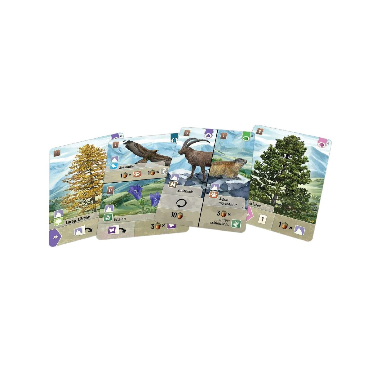 Mit Mischwald – Alpin erhält das gefeierte Kartenspiel seine erste Erweiterung. 36 neue Karten mit der wunderschön illustrierten Flora und Fauna der Alpen sorgen für noch mehr Diversität im Wald und reichlich Abwechslung am Spieltisch. Unter anderem bieten zwei neue Baumarten Möglichkeiten für unzählige Synergieeffekte. Auch über der Baumgrenze gilt: je nach Anzahl der Mitspielenden werden Karten vor Spielbeginn aus dem Spiel genommen. Gelingt es euch, die wertvollsten Spezies in euren Wald zu locken?