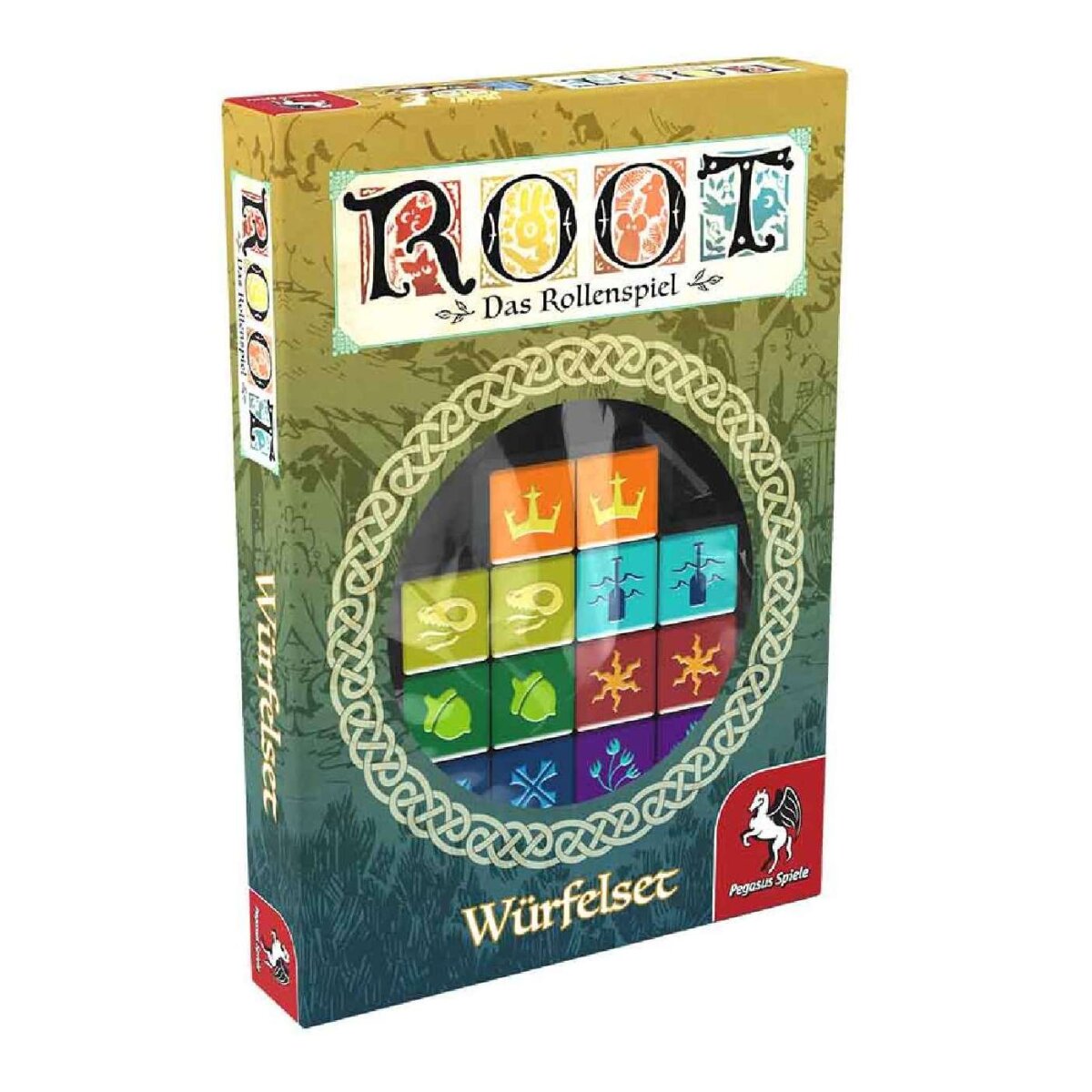 Dieses Würfelset für Root - Das Rollenspiel enthält 14 sechseitige Würfel. Je eines der sieben Würfelpaare trägt die Farbe und das Symbol einer der sieben Fraktionen des Waldlandes: