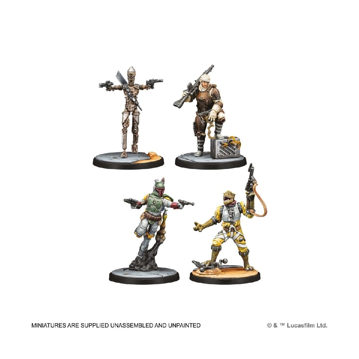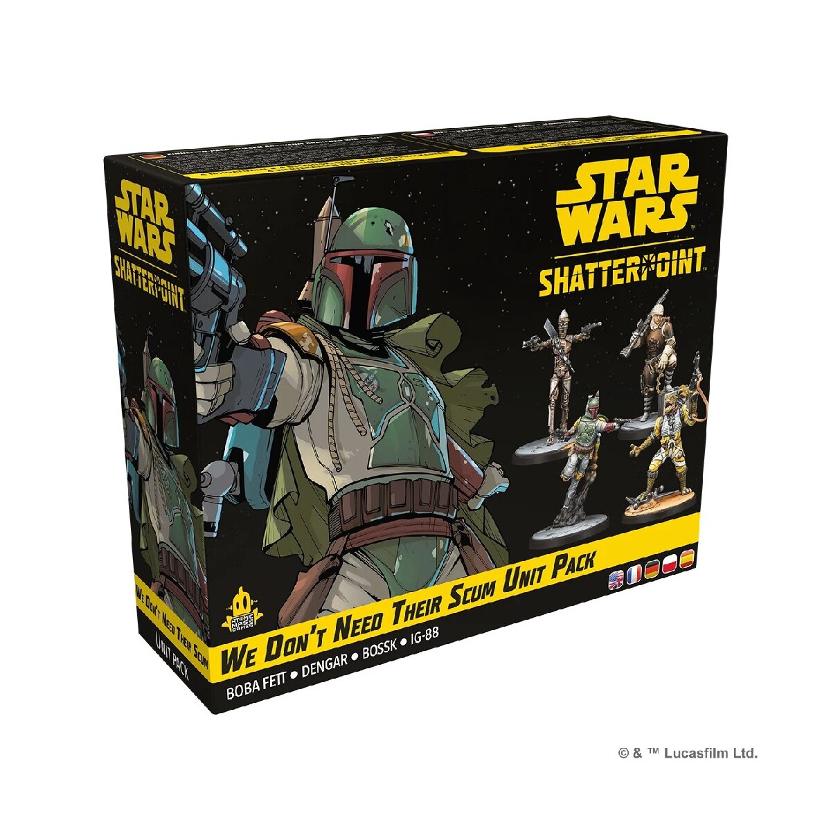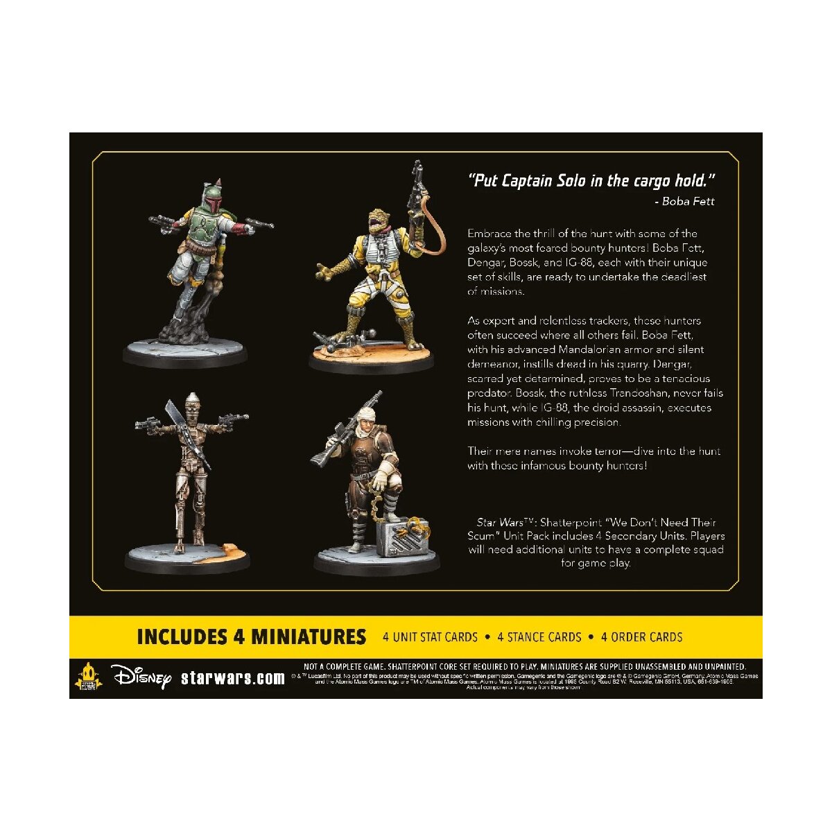 Der Squad-Pack „Diesen Abschaum brauchen wir nicht” beinhaltet die gefährlichen Kopfgeldjäger Boba Fett, Dengar, Bossk und IG-88 zum Erstellen eines Einsatzteams für das Skirmish-Miniaturenspiel Star Wars™: Shatterpoint.